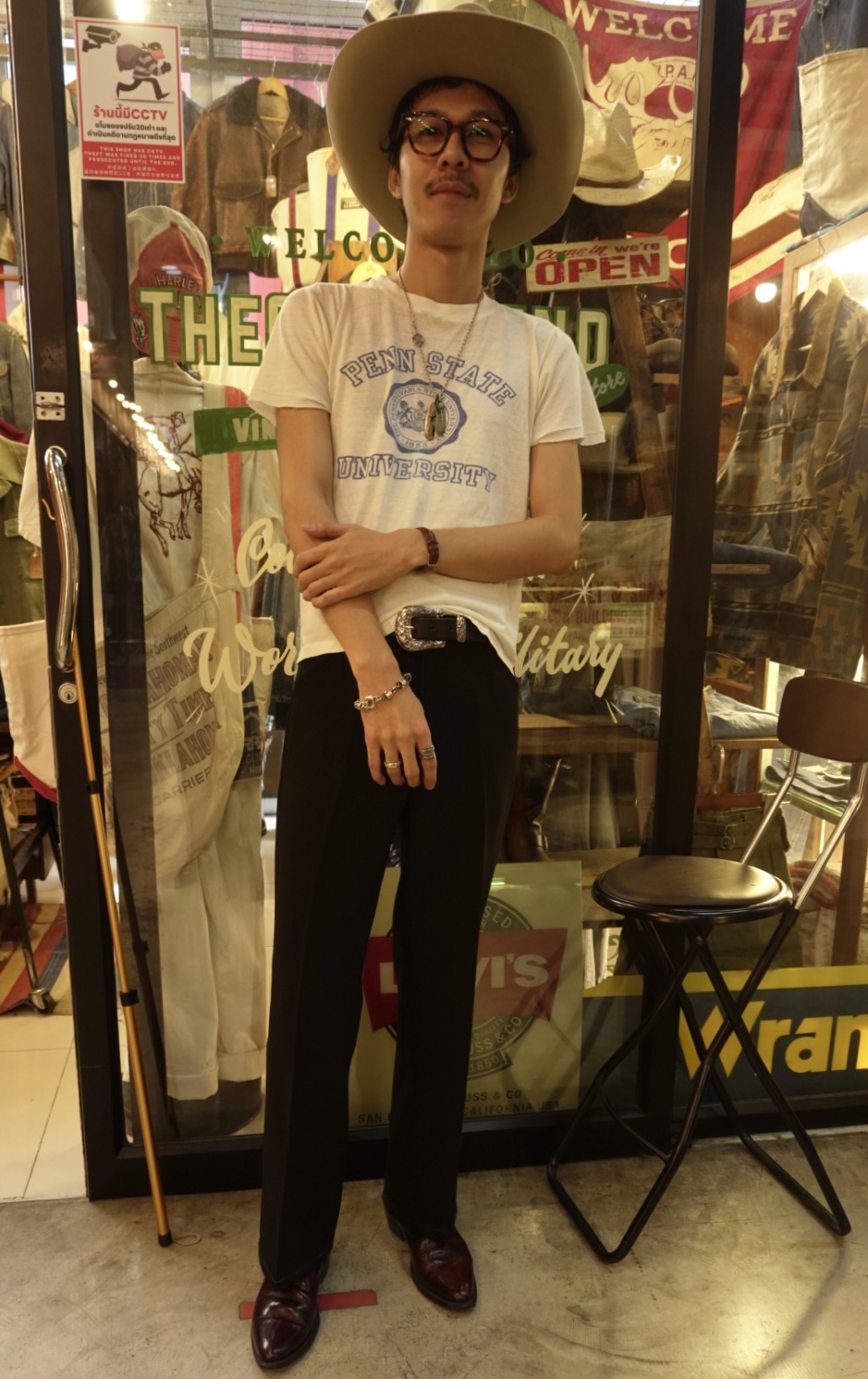 なにしてるの? ここの古着屋で働いてる、<The old friends>っていうんだ。なに着てるか教えてくれる? 今日はヴィンテージのハットにパンツ、それにカウボーイブーツ。サングラスもヴィンテージ。tシャツは70sかな。アクセサリーは全てインディアンジュエリーで時計は70sの<Tissot>。